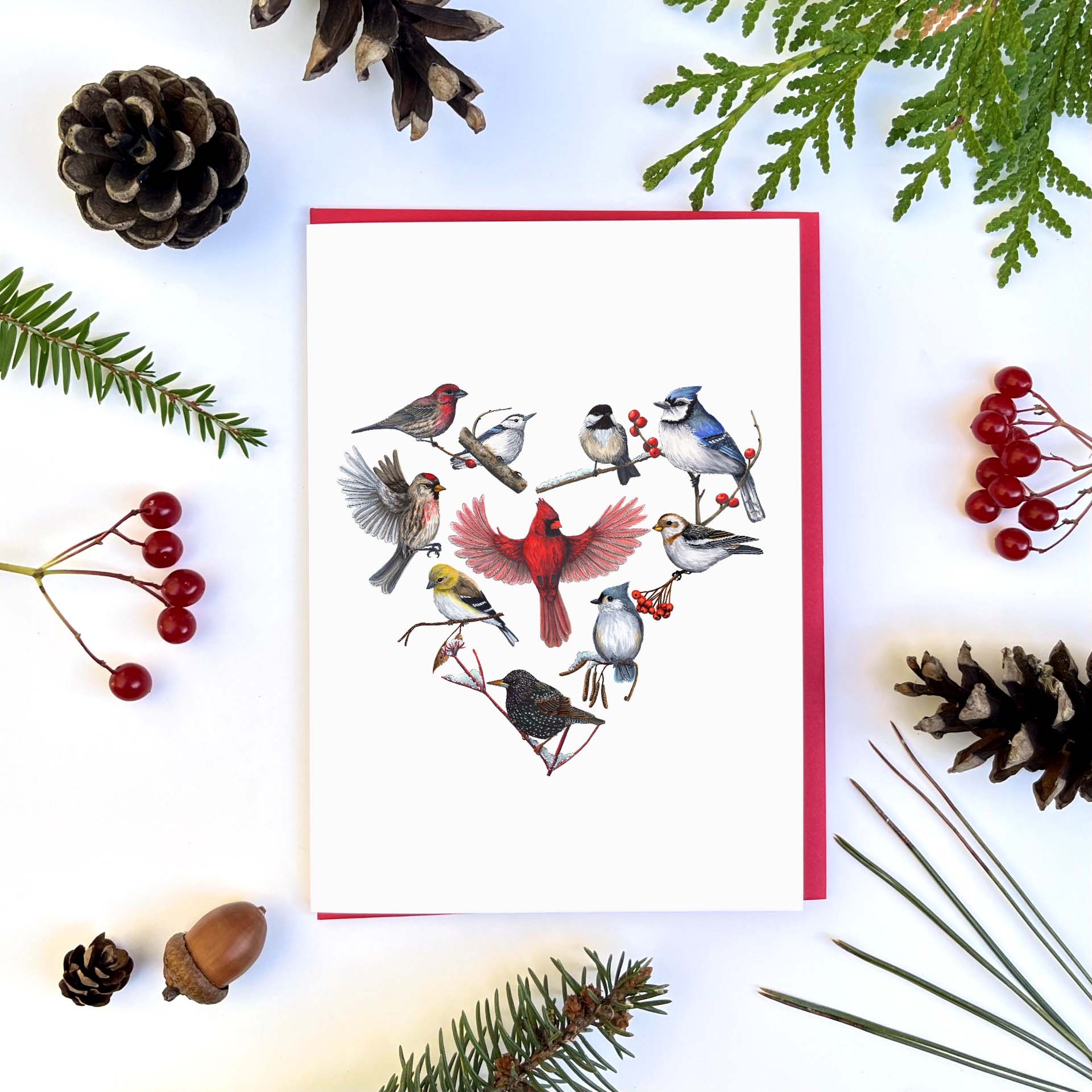 Cette jolie carte de souhaits est une ode aux oiseaux hivernaux. Cardinal, geai bleu, mésanges et compagnie ont regroupés afin de former un coeur d'oiseaux de nos hivers québécois. Les dessins originaux dont sont tirés cette carte ont été réalisé à l'encre et à l'acrylique sur du papier bristol.