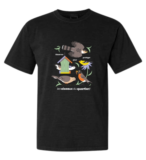 Soutenez nos projets de conservation avec ce t-shirt Grand Défi QuébecOiseaux Observer pour protéger… les oiseaux du quartier!
